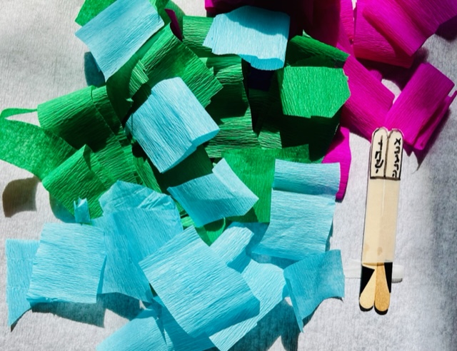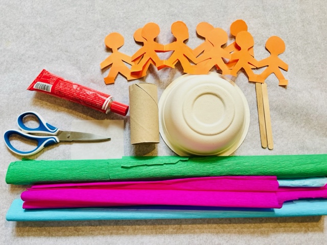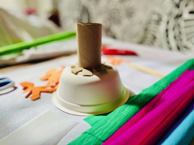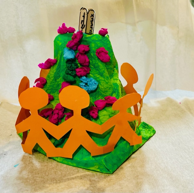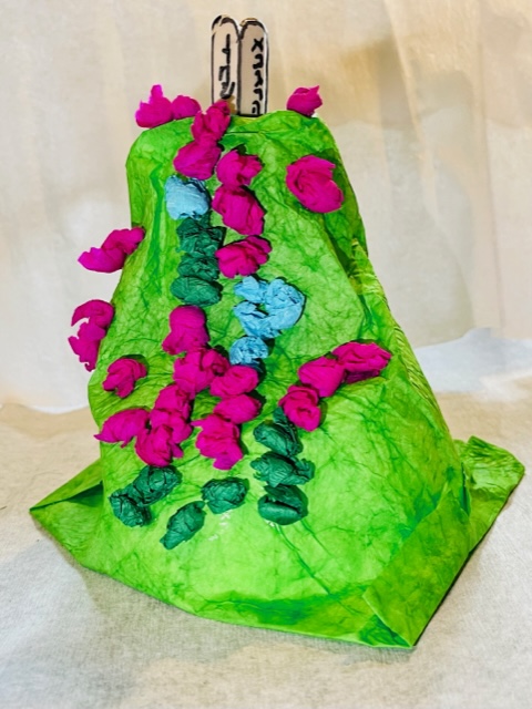A képen látható alapanyagokra van szükségünk. A tányérra ragasszuk fel a tekercset, vonjuk be csomagolópapírral, a tetején tűrjük be a tekercsbe, ragasszuk tele galacsinná gyúrt krepp papírvirágokkal. A két kőtáblát rajzoljuk fel a fapálcákra ragasztott pauszpapírra és rögzítsük a tetején. A gyereksereget harmonikává hajtott papírból vágjuk ki és ragasszuk őket össze, hogy kört formáljanak. A kész papírhegy köré természetesen tehetünk Lego emberkéket, vagy a korábban bemutatott kávékapszula lábakon álló figurákat is.