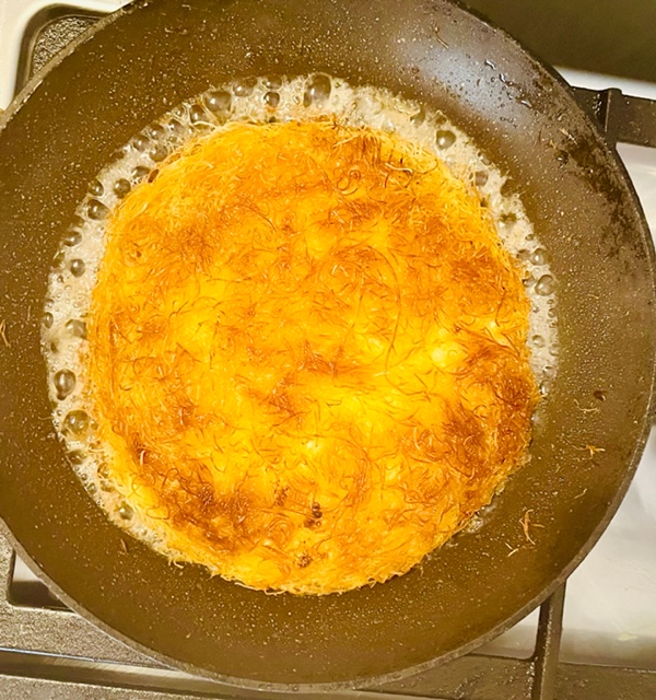 A tésztát jól szétszedjük, a csomagolásából kivéve tömbszerű, így szálakra kell bontani. Az olvasztott vajjal meglocsoljuk. A serpenyőbe tesszük az egyik kanál vajat, és a tészta felét szépen elrendezzük rajta. A mozzarella és a ricotta keverékét elosztjuk a tésztán, a tészta másik felét is rátesszük, majd öt perc közepes lángon sütést követően egy tányér segítségével átfordítjuk. Újabb öt percet sütjük, majd a hőt lekapcsoljuk. Lassan ráöntjük a szirupot, amelyet a sütemény szinte teljes egészében felszív. Tálaláskor megszórjuk a pisztáciával. Frissen a legjobb, bár ebből a sütésből egy kis darab megmaradt, a délutáni alvás után a konyhába érkező gyermeknek hidegen is ízlett. A kadaif tésztát érdemes beszerezni, egy csomagban negyven deka van, ami két nagyobb és egy kisebb süteményhez elég.