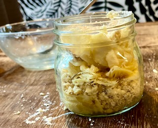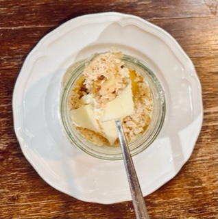 A tésztát kézzel összemorzsoljuk, vagy hagyjuk, hogy gyermekünk tegye. Az almát beleforgatjuk a lisztes cukros vajba. Az almás keverék felét a befőttes üveg aljára tesszük, rá a tészta keverék felét, aztán az alma másik felét, rá a maradék tésztát. Mikróban 4 perc alatt elkészül, 800 W teljesítményen. Amíg forró, rákanalazzuk a sajtkrémet és a mézet. Ebből az adagból két bögrényi, vagy egy fél literes befőttesüvegnyi készül. Meglepően finom és nagyon hamar elkészül. Remek móka anya kedvenc bögréjében sütit sütni.