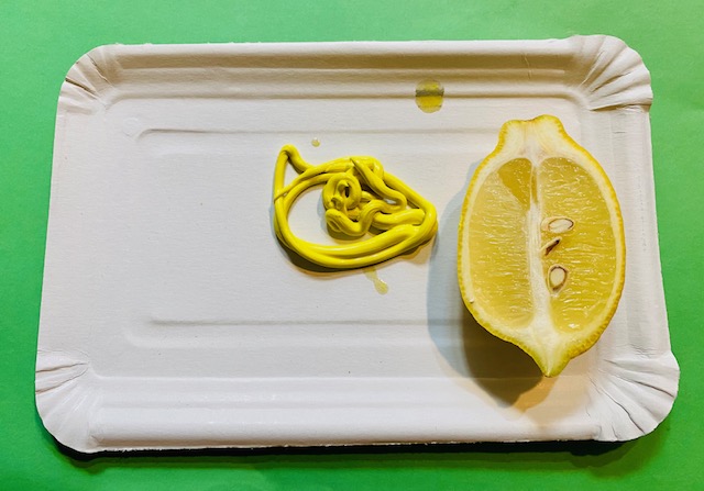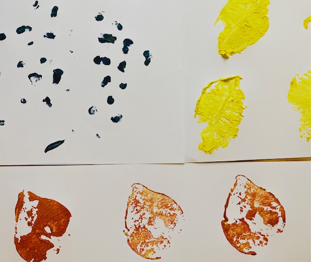 Akrilfesték, vagy tempera segítségével készítsünk gyümölcslenyomatokat, citrom, alma, körte, szőlő megfestett felületét vastagabb rajzlapra nyomjuk, egy gumikesztyű és egy villa segítségével.