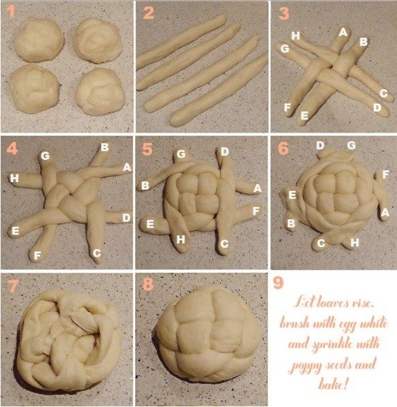 Osszuk kétfelé a megkelt tésztánkat, majd a két darabot 4-4 felé és sodorjuk rudakká őket. Fonjuk a kalácsainkat kerekre a kép segítségével. Elsőre bonyolultnak tűnik, de nézzétek meg másodjára is! Nem is olyan bonyolult ez! Jótanács! Ha szó szerint körbeértetek a fonatokkal, akkor nyugodtan igazítsátok a kalács alá a végeket! Sőt, egy kicsit alányúlva a közepét megemelhetitek és még szebb lesz a kalácsotok! Ha végképp nem boldogultok, az interneten sok videó van a kerek kalácsfonásról.