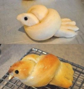 Formázzunk kis csőrt és mazsolát tegyünk szem gyanánt a fejre. A kismadarunk farkát képező tésztadarabot kissé lapítsuk el és éles késsel vagdossuk be. A szokott módon süssük meg, figyelve arra, hogy ne süljenek túl!