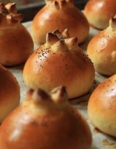 Addig dagasszuk, amíg enyhén ragacsos tésztát kapunk. Ha szükséges, adjunk hozzá még egy kis lisztet, de ha úgy ítéljük meg, akkor vizet adjunk még hozzá. Ha összeállt a tésztánk, fóliával takarjuk le, és egy-két órát kelesszük. Miután szépen megkelt a tészta, tegyük lisztezett deszkára és osszuk kb. 15 részre, melyből egy darabot mindjárt tegyünk is félre, ebből készítjük majd a gránátalmáink koronáit. A tésztadarabokból formázzunk kerek golyókat és helyezzük sütőpapírral bélelt tepsibe vagy sütőlapra, takarjuk le és kelesszük újra félórát. A sütőt melegítsük elő 180 fokra. A tésztagolyókat kenjük meg a felvert tojással. Abból a tésztarészből, amit félretettünk, készítsünk kis golyókat, annyit, ahány zsemle van. Minden zsemle tetejére tegyünk egy kis tésztagolyót, és azt is kenjük meg tojással. Éles és tiszta ollóval vágjuk be a kisebb golyókat, a képen látható módon. A tetejére szórjunk mákot vagy szezámmagot. Körülbelül 25 percig süssük, amíg meg nem pirul.