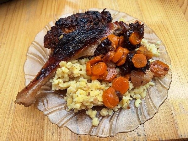 Töltött kacsacomb tarhonyával, sárgarépás-aszaltszilvás-almás cimesszel
