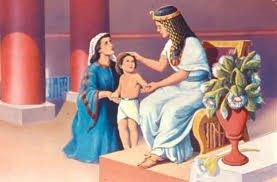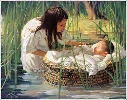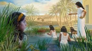 Történt ugyanis, hogy egy nap a Fáraó lánya fürdeni ment a folyóhoz. A Nílus partján fürdőző hercegnő meglátta a kosarat, majd egy szolgálóját küldte a vízbe érte. Mikor belenézett, egy gyönyörű fiúgyermeket talált benne. Természetesen egy midrás mesél nekünk arról, hogy a gyermek panaszosan sírdogált, mert nagy valószínűséggel éhes volt, mikor kihúzták őt a folyóból. Bátjá elhozatta az összes egyiptomi asszonyt, hogy közülük szoptatós dajkát találjon neki.